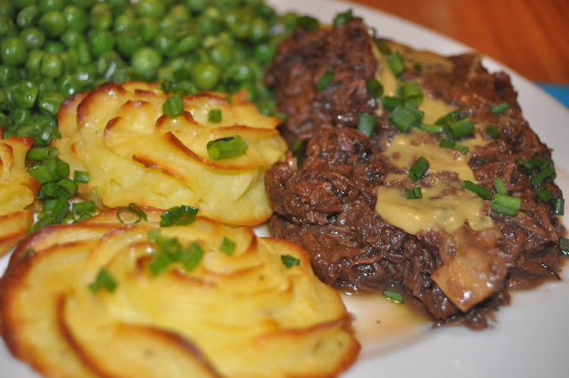This is a meal that is sure to impress, but takes very little skill to make. The Carbonnade Flamande, while very fancy sounding, is an extremely simple recipe with very little activity demanded from you; your oven does most of the work. The Duchess Potatoes merely require the most basic of piping skills, yet the end result looks like you slaved over your starch.